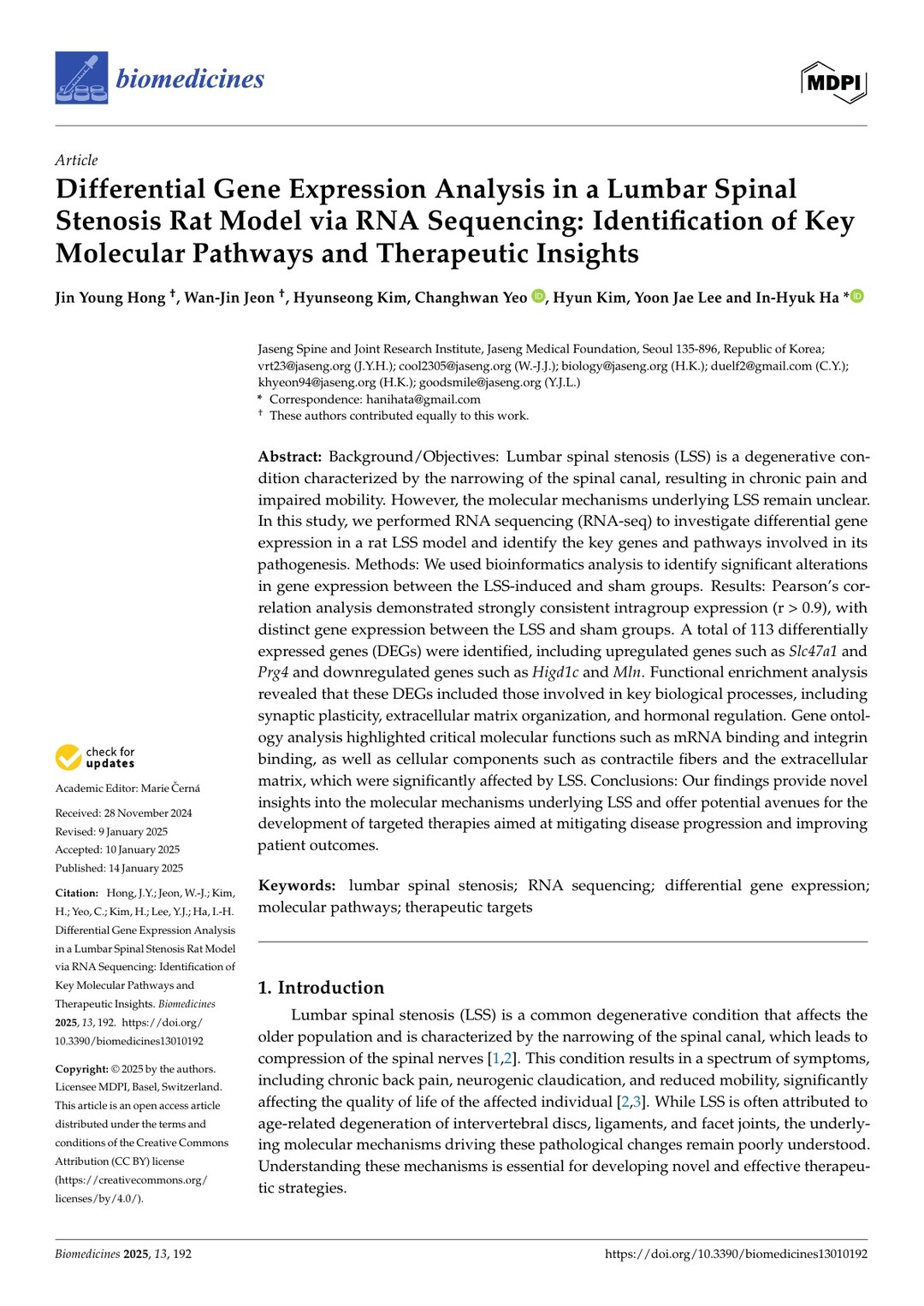 자생한방병원 척추관절연구소(하인혁 소장) 홍진영 박사 연구팀은 척추관협착증의 새로운 치료 전략을 모색하기 위한 연구 결과를 SCI(E)급 국제학술지 '생의학(Biomedicines(IF=3.9))'에 게재했다고 2일 밝혔다.