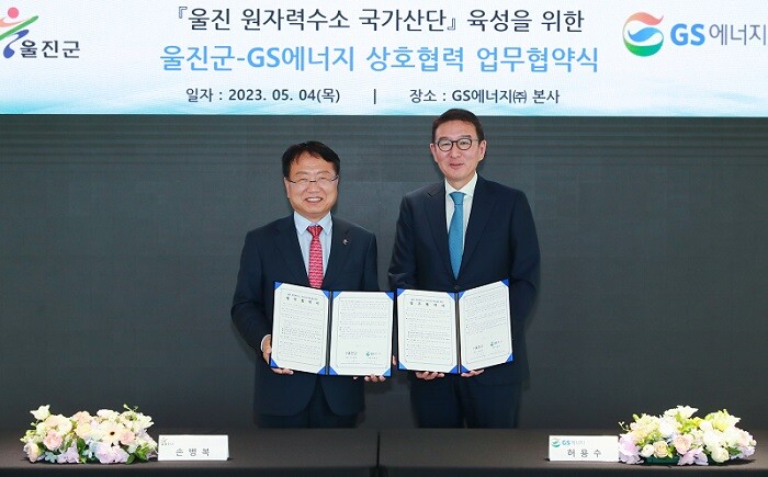 | ▲ 손병복 울진군수(왼쪽)와 허용수 GS에너지 사장이 지난 5월 4일 서울 역삼동 GS타워에서 '울진 원자력수소국가산업단지 육성을 위한 업무협약(MOU)'을 체결한 뒤 기념촬영하고 있다. [울진군] |