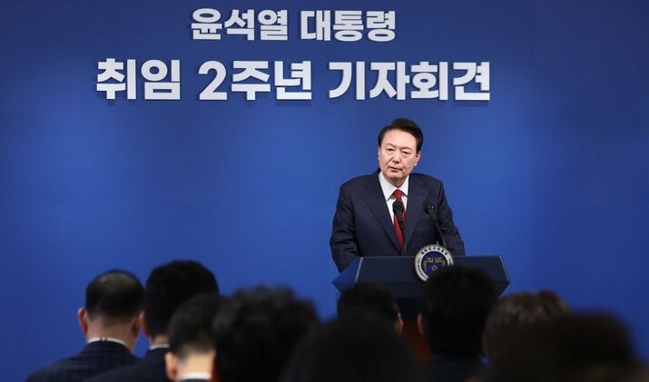 | ▲ 윤석열 대통령이 9일 서울 용산 대통령실에서 열린 취임 2주년 기자회견에서 취재진 질문에 답하고 있다. [뉴시스] |