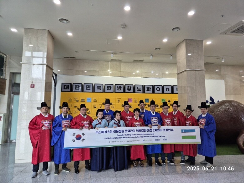 | ▲ 21일 우즈베키스탄 국립아동병원 연수팀이 동의보감촌에서 기념촬영을 하고 있다. [산청군 제공] |