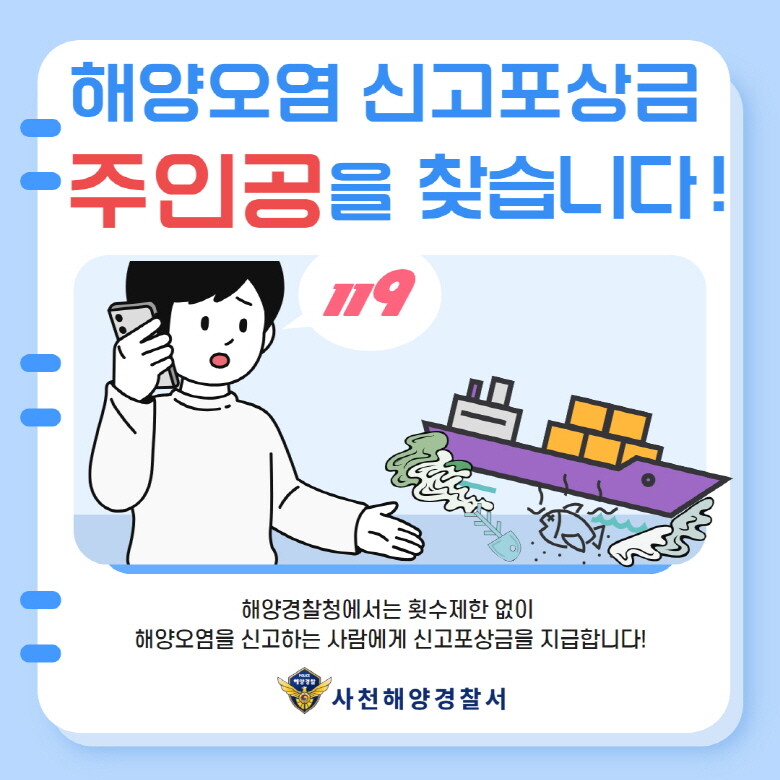 경남 사천해양경찰서(서장 장성환)는 해양오염 피해를 줄이기 위해 '신고포상금 제도'를 운영하고 있다고 1일 밝혔다.