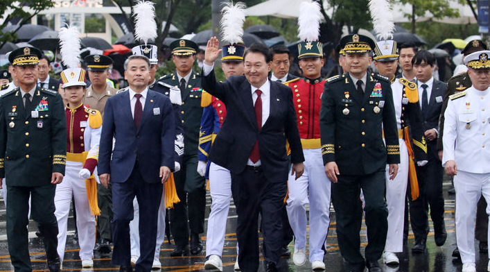 ▲ 윤석열 대통령이 지난 26일 서울 세종대로 일대에서 진행된 건군 75주년 국군의 날 시가행진에서 육조마당을 향해 행진하며 손을 흔들고 있다. [뉴시스]