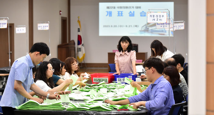 ▲ 대구시선관위 대회의실에서 지난 20일 관계자들이 제22대 국회의원선거 대비 개표 실습을 하고 있다. [뉴시스]