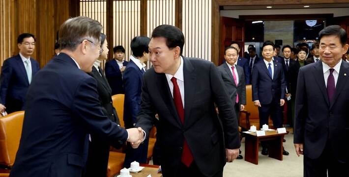 ▲ 윤석열 대통령이 31일 국회에서 2024년도 예산안 및 기금운용 계획안에 대한 정부 시정연설에 앞서 열린 국회의장, 여야 지도부, 5부요인 사전 환담에서 더불어민주당 이재명 대표와 만나 악수하고 있다. [뉴시스]