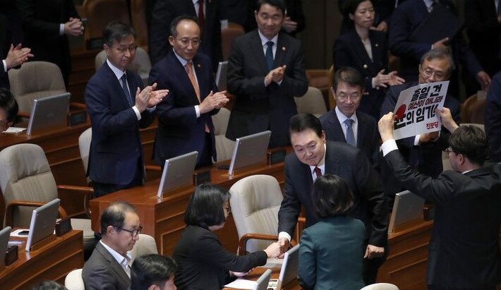 윤 대통령이 먼저 손을 건네자 상당수 민주당 의원은 일어나 악수했다. 임종성·이형석 의원은 다소 굳은 표정으로 앉은 채 손을 잡았다. 윤 대통령에게 눈길을 주지 않고 외면한 의원들도 있었다. 국민의힘 의원들은 기립해 박수를 보냈다.
