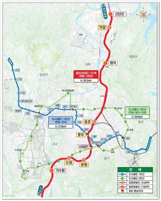 충청권 광역철도 1단계는 호남선 KTX 개통 등으로 발생한 호남선과 경부선 여유 용량을 활용, 총 2598억 원을 투입해 계룡에서 신탄진까지 총연장 35.4㎞ 구간에 광역철도망을 구축하는 사업이다.