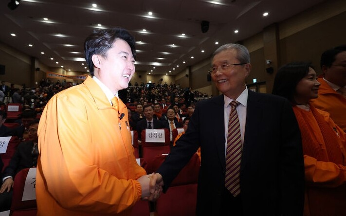 | ▲ 개혁신당 이준석 대표(왼쪽)가 지난달 20일 국회 의원회관에서 열린 중앙당 창당대회에서 국민의힘 김종인 전 비대위원장과 인사를 나누고 있다. [뉴시스] |