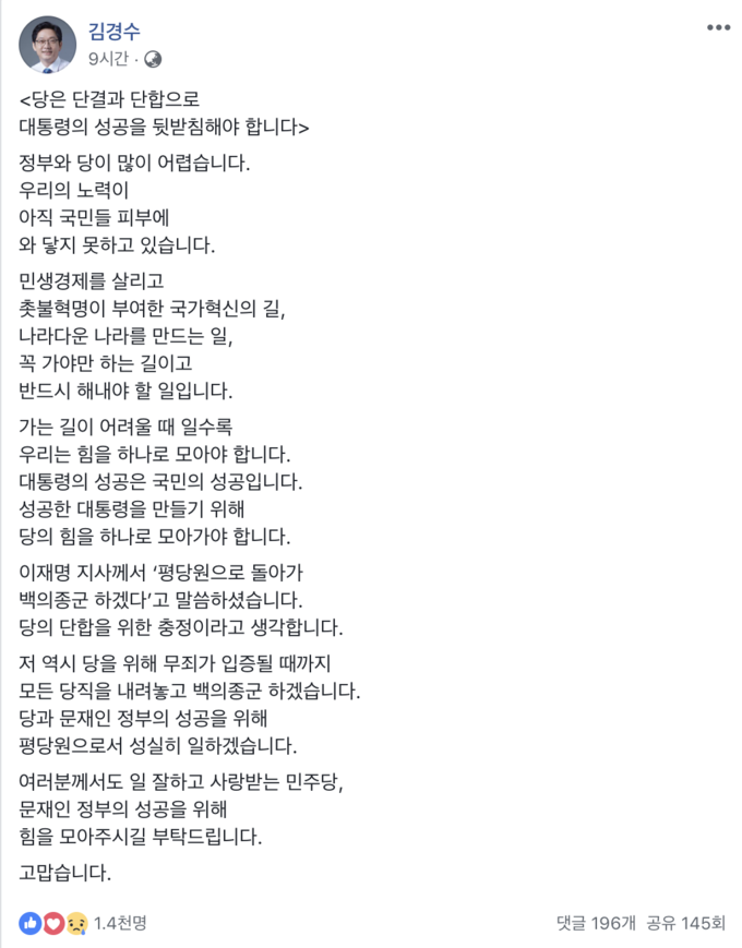 김 지사는 지난 12일 자신의 페이스북에 올린 글에서 "이재명 지사가 '평당원으로 돌아가 백의종군하겠다'고 말했다"며 "저 역시 당을 위해 (드루킹 댓글 조작 사건) 무죄가 입증될 때까지 모든 당직을 내려놓고 백의종군하겠다"고 말했다.