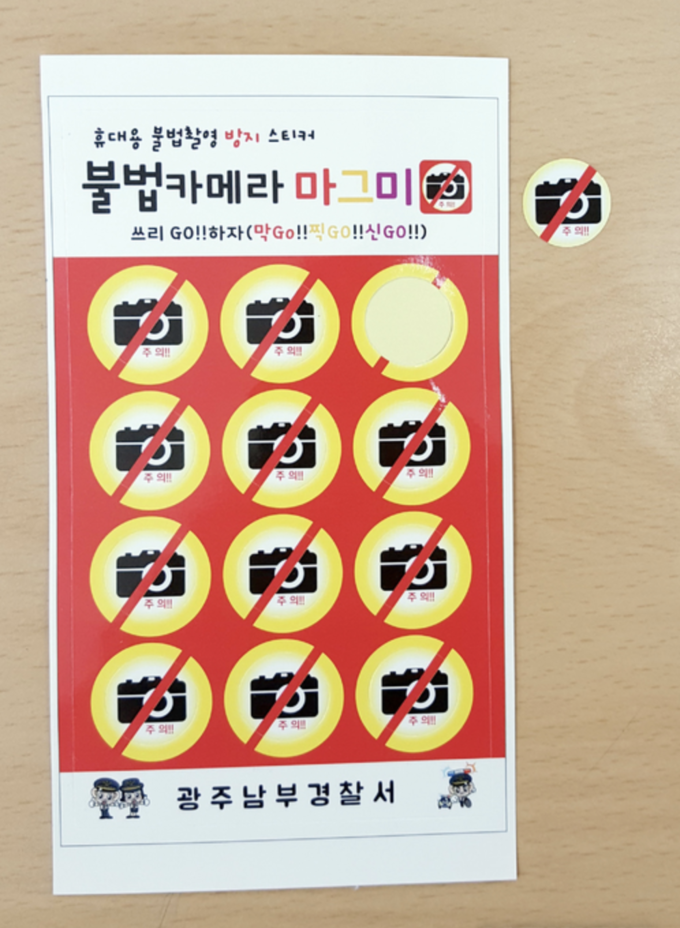▲ 2019 광주 세계수영연맹(FINA) 세계선수권대회에서 여자 수구선수들의 신체를 몰래 촬영하다가 적발된 일본인 A(37) 씨가 14일 불구속 입건됐다. 사진은 광주 남부경찰서 직원들이 자체 제작한 '불법카메라 마그미 안심 스티커' [광주 남부경찰서 제공]