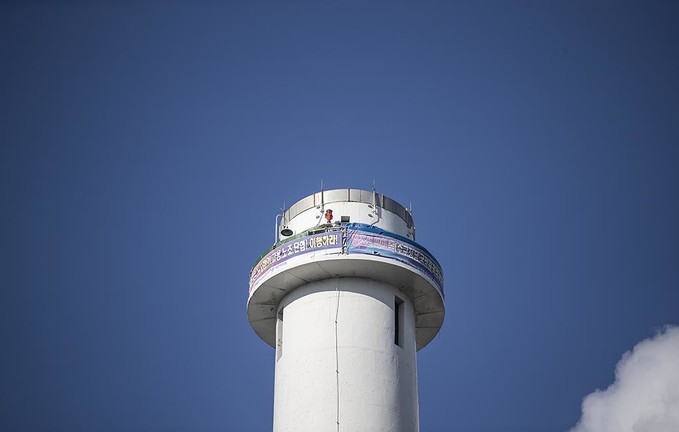 ▲ 지난 12월28일 오후 서울 양천구 서울에너지공사 목동열병합발전소 굴뚝에 홍기탁 파인텍지회 전 지회장과 박준호 사무장이 고용 승계 약속 이행을 촉구하며 굴뚝농성을 이어가고 있다. [정병혁 기자]