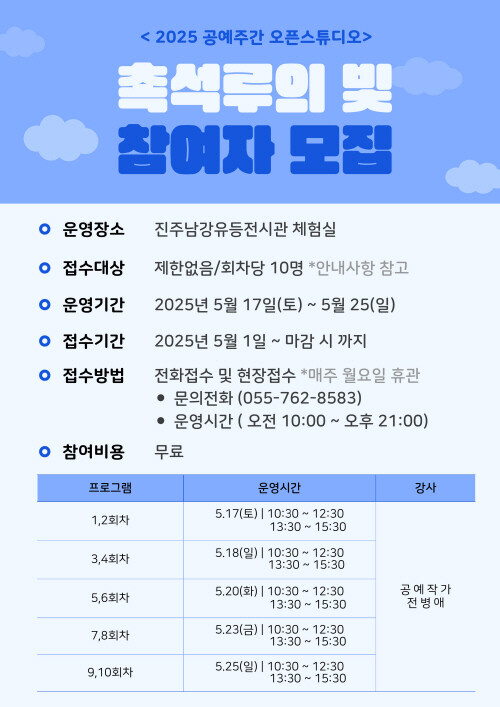 이 프로그램은 전병애 공예작가와 함께 촉석루의 빛을 담은 등을 만들어볼 수 있는 체험행사다. 오는 17일부터 25일까지 총 10회차 운영되며, 체험비는 무료다.