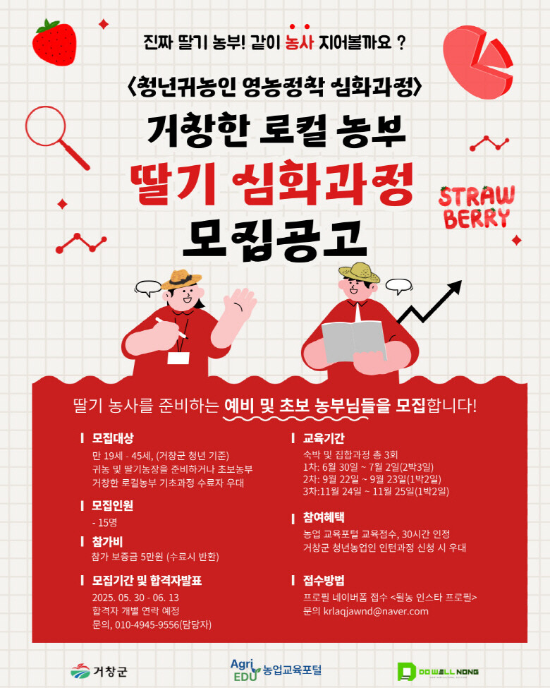 경남 거창군은 지방소멸대응기금으로 추진하는 청년 귀농인 영농정착 프로그램 '딸기 심화과정'에 참여할 교육생을 모집한다고 4일 밝혔다.