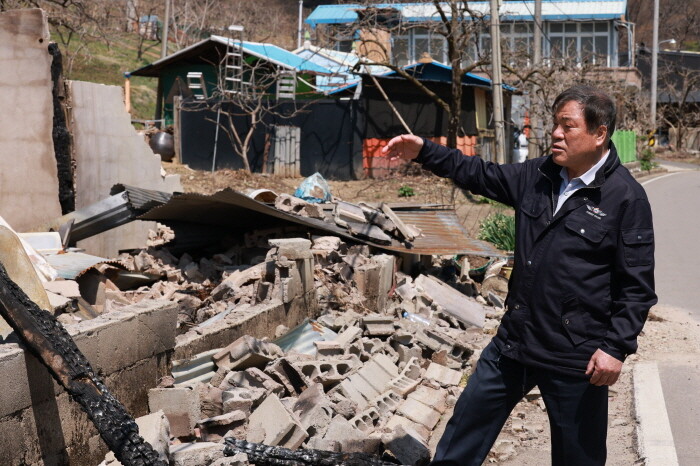 ▲ 이승화 군수가 산불로 주택 피해를 입은 현장을 살펴 보고있다. [산청군 제공]