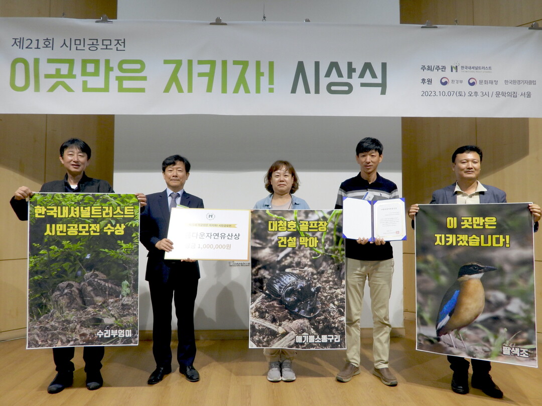 | ▲대청호골프장 건설반대 사진판넬을 들고있는 환경단체 회원들.[대책위 제공] |
