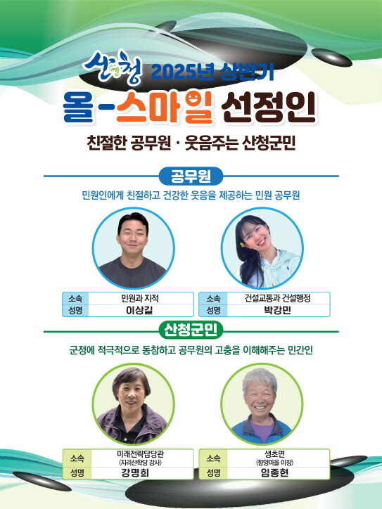경남 산청군은 '2025년 상반기 올-스마일 민원 공무원과 민간인'을 선정했다고 29일 밝혔다.