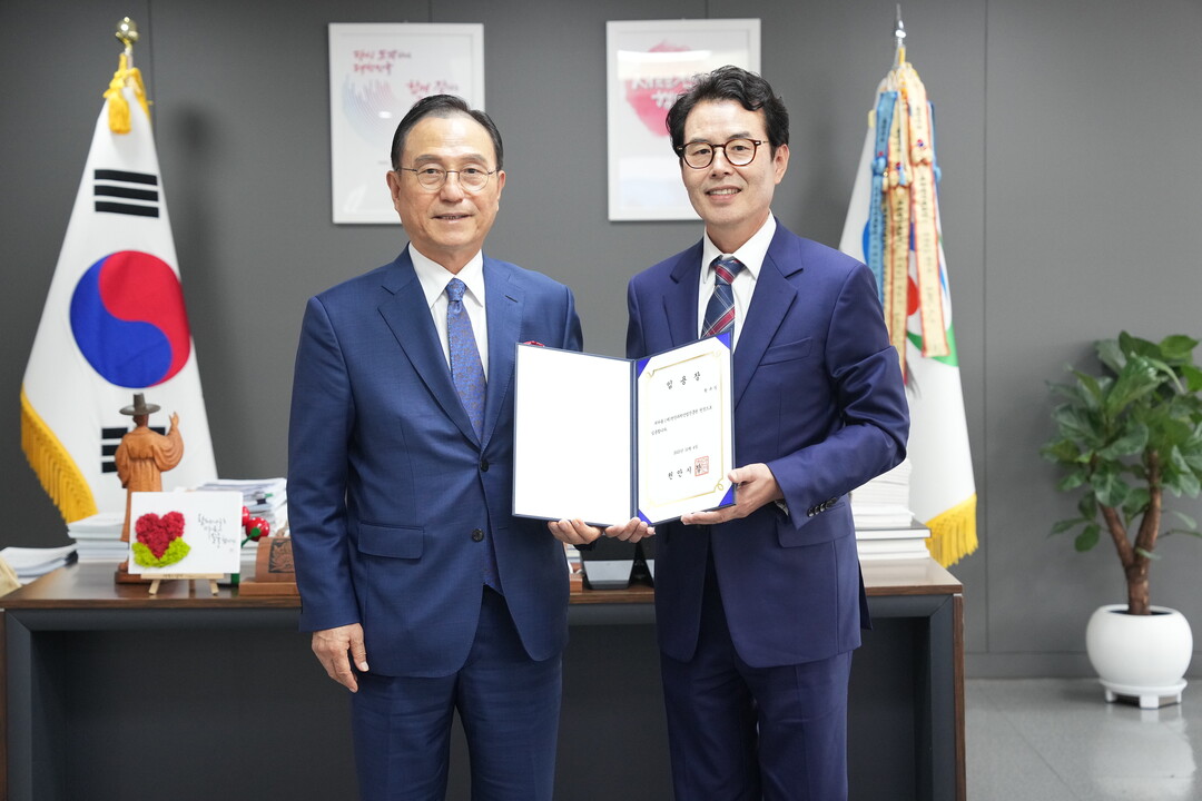 ▲황규일(우측) 신임 천안과학산업진흥원장과 박상돈 시장.[천안시 제공]