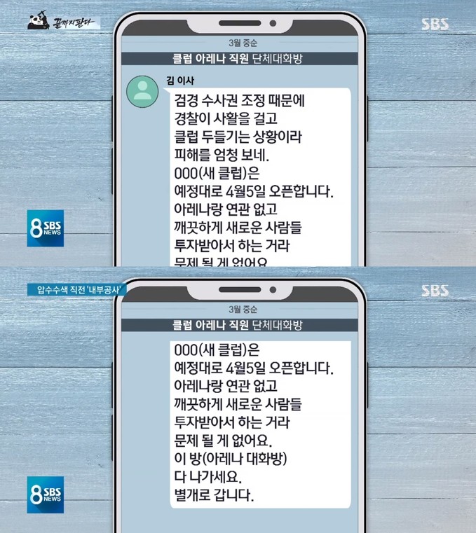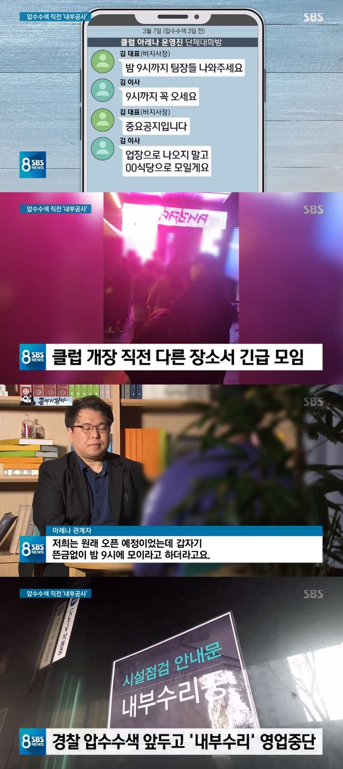 지난 3일 오후 방송된 SBS '8 뉴스'에서는 지난달 10일 경찰이 압수수색한 서울 강남구 클럽 아레나와 관련해 클럽 운영진의 공모 내용이 담긴 단체 대화방 내용이 전해졌다.