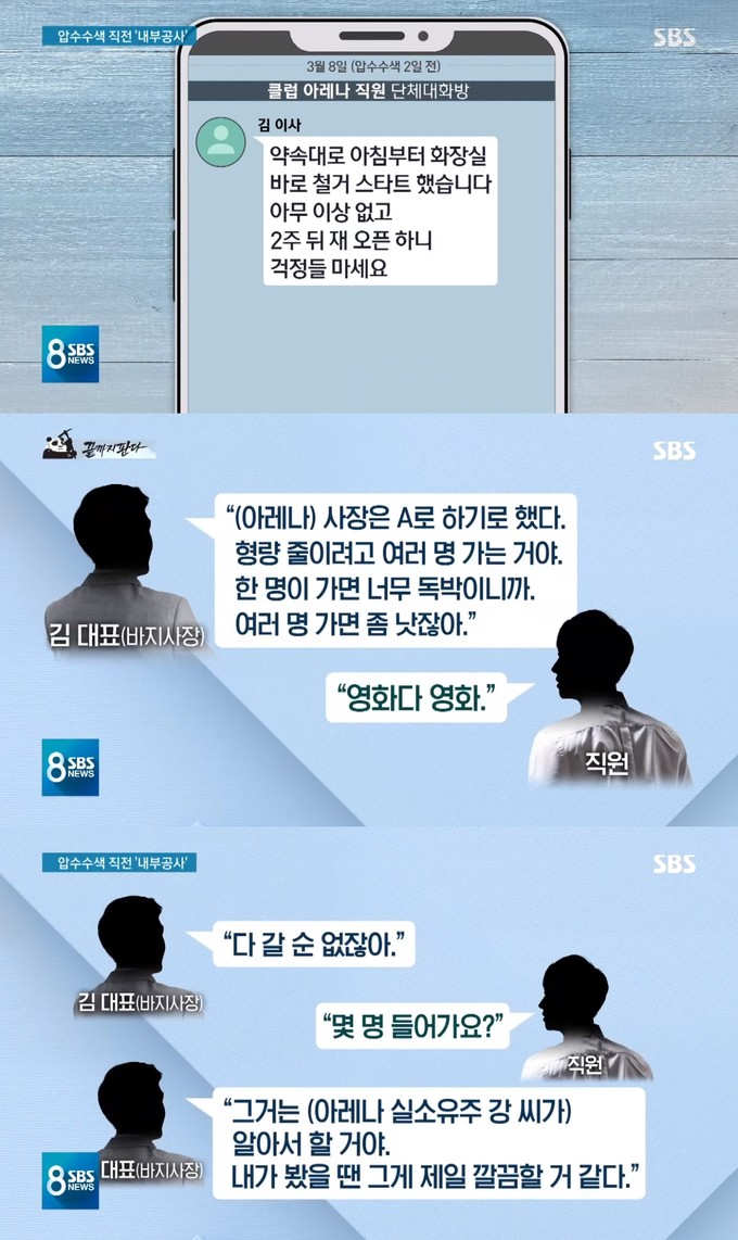 실제 지난달 7일 아레나는 '내부 수리 중'이라는 안내문을 붙이고 영업을 중단했다. 다음날 김 이사는 단체 대화방에서 "약속대로 아침부터 화장실 바로 철거 스타트했다. 아무 이상 없고 2주 뒤 재오픈하니 걱정들 말라"고 말했다.