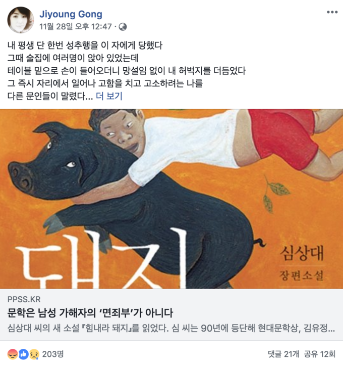 앞서 공지영 작가는 지난달 28일 심 작가로부터 과거 성추행을 당했다고 주장했다. 그는 페이스북에 심 작가의 신간 '힘내라 돼지' 관련 기사 링크를 첨부하면서 "내 평생 단 한 번 성추행을 이 자에게 당했다"는 내용의 글을 게재한 바 있다.