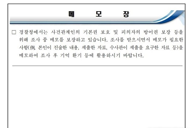 ▲ 경찰이 5일부터 피의자나 피해자, 참고인 등 사건 관계인에게 나눠주게 되는 메모장 양식 [경찰청 제공]