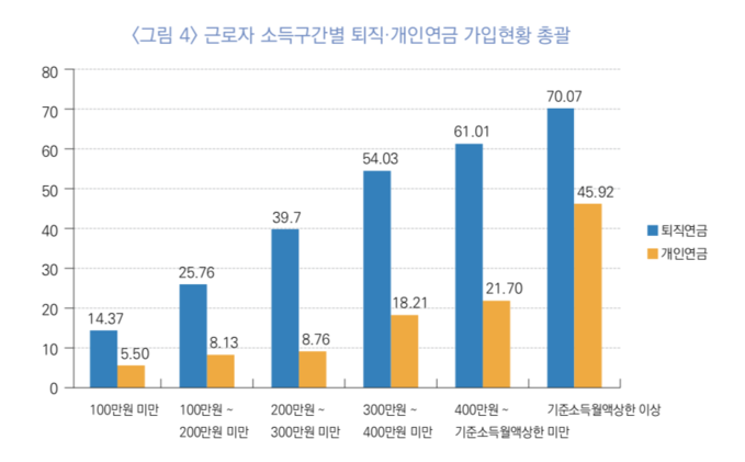 반면 월 소득 100만원 미만 저소득자는 14.37%가 퇴직연금에, 5.5%가 개인연금에 가입하고 있어, 100명 중 5명 만이 3종의 연금소득을 모두 확보할 수 있다. 100만원 이상~200만원 미만 소득자는 8.13%(퇴직연금 25.76%), 200만~300만원 미만 노동자는 8.76%(퇴직연금 39.7%)에 불과했다.