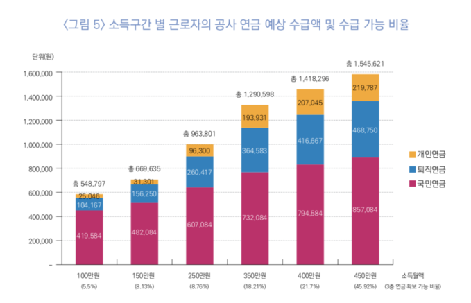 평생 받을 수 있는 예상 연금 총액도 소득수준에 따라 최대 2.8배가 넘는 차이를 보였다. 국민연금과 퇴직연금, 개인연금을 모두 25년간 가입했다고 가정했을 때, 월 450만원 이상 소득자는 은퇴 후 매달 154만5621원을 받는다.
