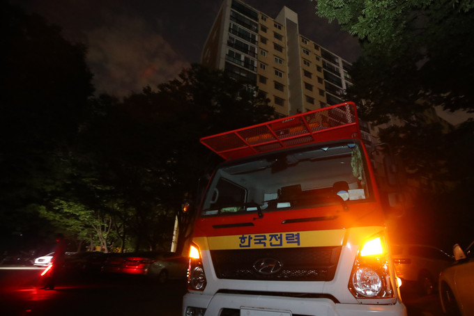 ▲ 12일째 열대야가 이어진 1일 밤 대규모 정전이 발생한 서울 강남구 대치동 선경아파트에 한국전력의 긴급 복구차량이 세워져 있다. [연합뉴스 제공]