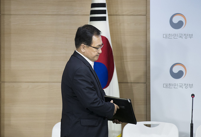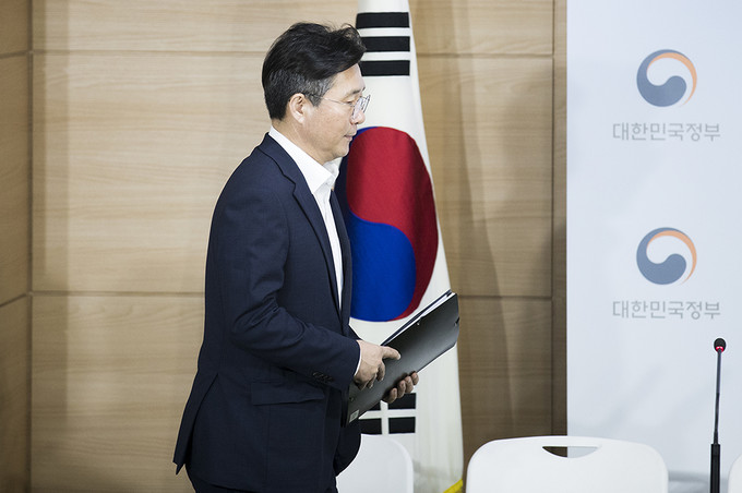 유영민 과학기술정보통신부 장관이 5일 오전 서울 종로구 정부서울청사에서 열린 대의의존형 산업구조 탈피를 위한 소재·부품·장비 경쟁력 강화 대책 브리핑에 참석하고 있다.