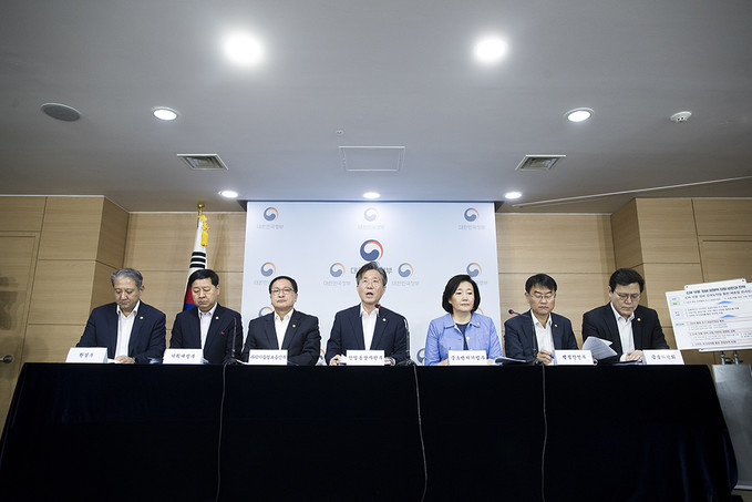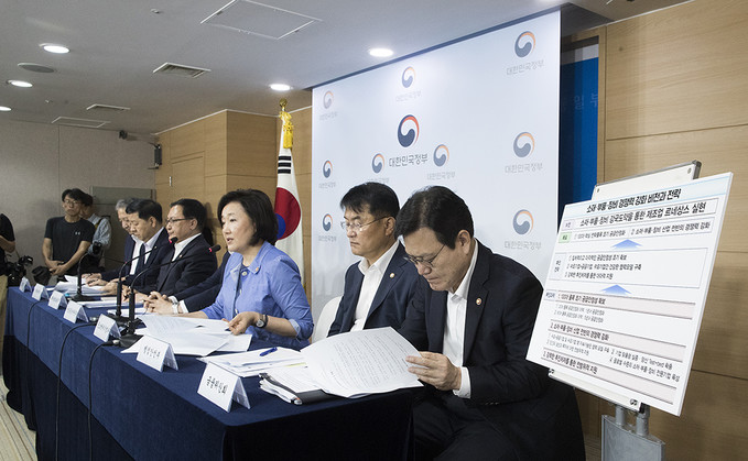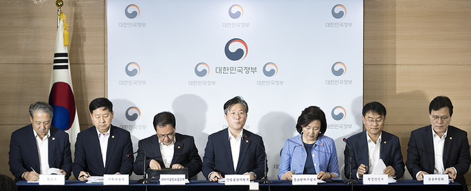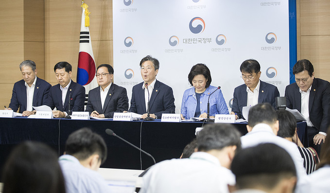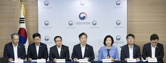 성윤모 산업통상자원부 장관 등 관계부처 관계자들이 5일 오전 서울 종로구 정부서울청사에서 대의의존형 산업구조 탈피를 위한 소재·부품·장비 경쟁력 강화 대책을 발표하고 있다. 왼쪽부터 박천규 환경부 차관, 구윤철 기획재정부 제2차관, 유영민 과학기술정보통신부 장관, 성윤모 산업자원통상부 장관, 박영선 중소벤처기업부 장관, 윤종인 행정안전부 차관, 최종구 금융위원장.