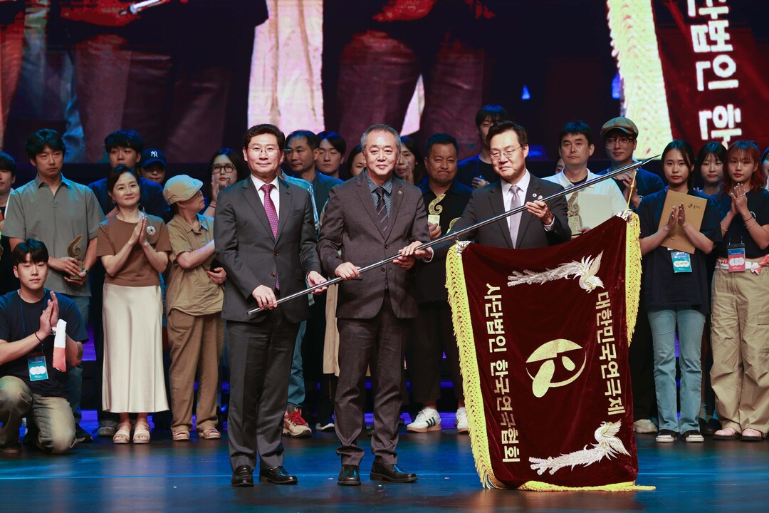 ▲ 이상일(앞줄 왼쪽) 대회장이 '대한민국연극제' 2025년 개최지 인천광역시에 대회기를 이양하고 있다. [용인시 제공]