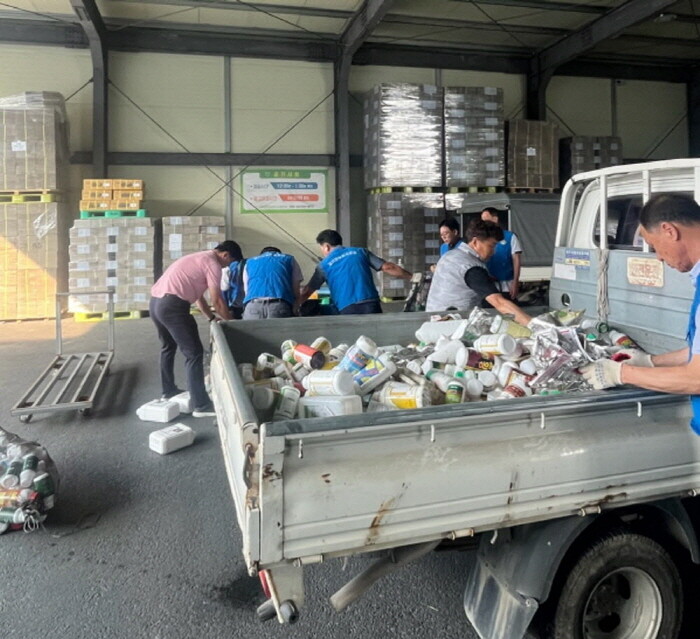 ▲ 금산면 농촌지도자회 회원들이 농협자재센터에서 폐비닐·빈 농약병을 수거하고 있다. [진주시 제공]