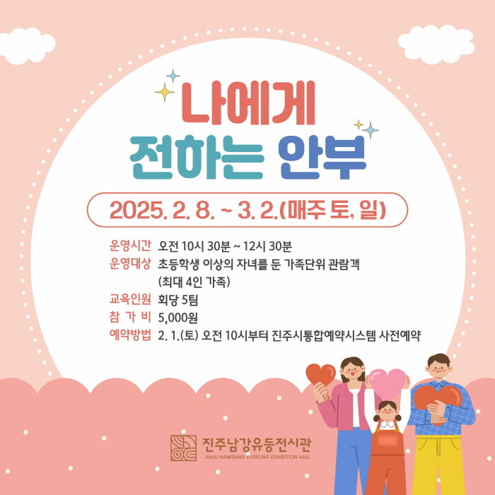 사전 예약은 2월 1일 오전 10시부터 진주시통합예약시스템을 통해 선착순으로 이뤄진다. 자세한 사항은 진주남강유등전시관 누리집을 참조하면 된다.