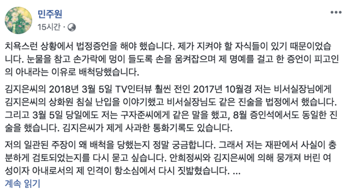민주원 씨는 20일 밤 자신의 페이스북을 통해 "김지은 씨의 거짓말이 법정에서 사실로 인정되는 것만은 절대 그냥 넘어갈 수가 없다"며 "두 사람은 연애를 하고 있었다"고 주장했다.