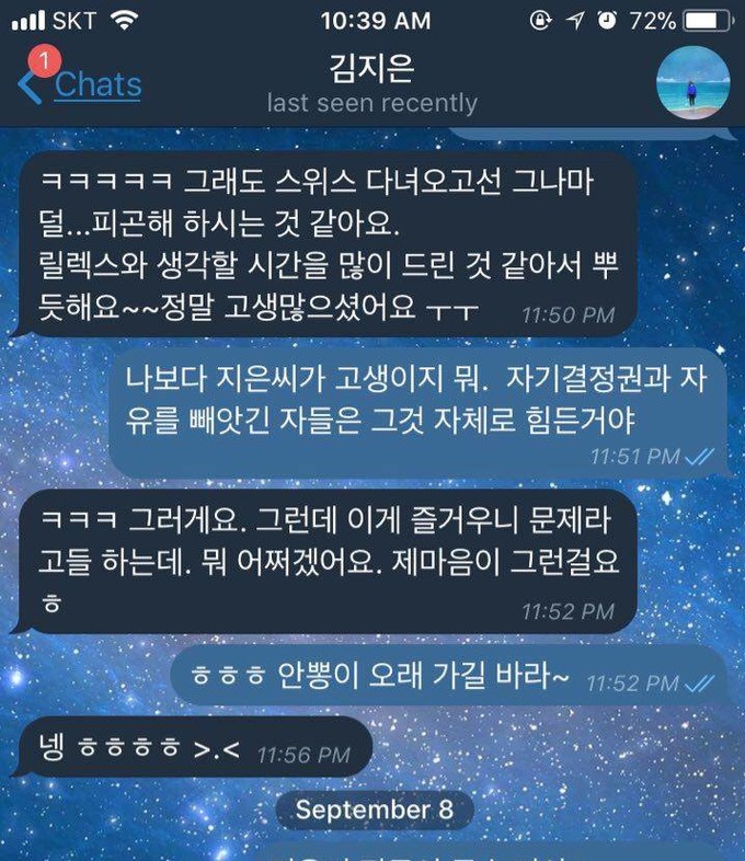 또 4일 후 스위스에서 귀국하던 2017년 9월 8일 김지은 씨가 지인에게 보낸 카톡 내용도 공개했다.
