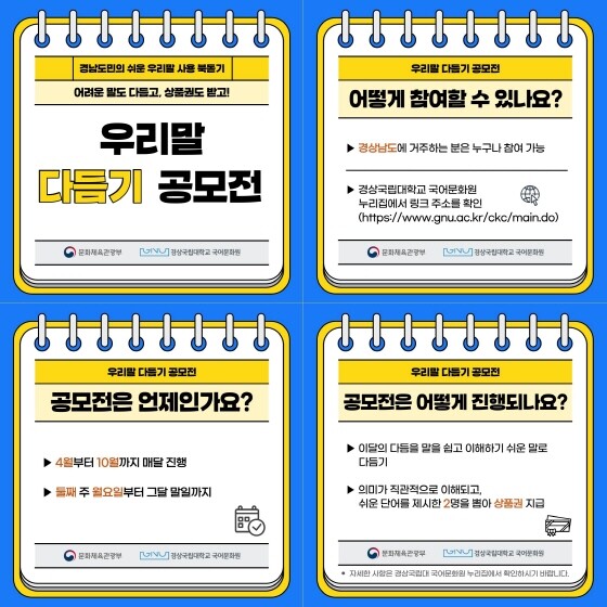 우리말 다듬기 공모전은 매달 둘째주 월요일부터 그달 말일까지 진행된다. 경남도민이라면 누구나 참가할 수 있다. 또한 '이달의 다듬을 말'은 경상국립대 국어문화원 누리집에서 확인 가능하다. 다듬은 말 제출은 네이버폼으로 하면 된다.