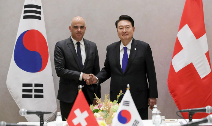 윤 대통령은 알랭 베르세 스위스 대통령을 만나 "양국 수교 60주년이자 스위스의 '한반도 중립국감독위' 참여 70주년을 기념하는 올해에 양자 회담을 하게 돼 기쁘다"고 말했다.