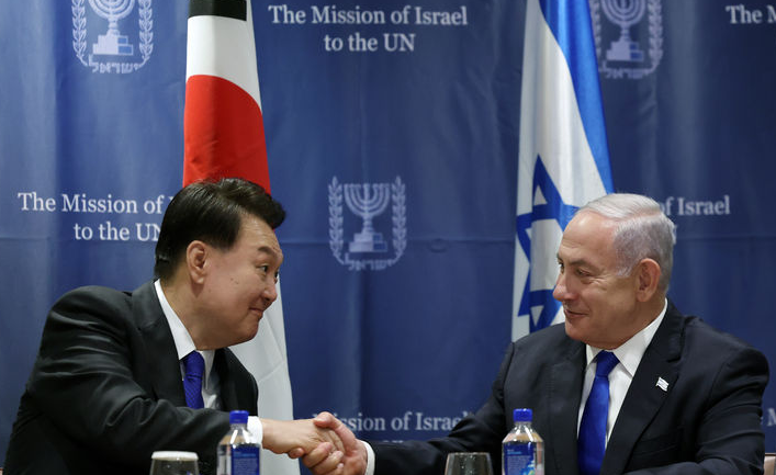 | ▲ 미국을 방문 중인 윤석열 대통령이 20일(현지시간) 뉴욕에서 열린 한-이스라엘 정상회담에서 베냐민 네타냐후 이스라엘 총리와 악수하고 있다. [뉴시스] |