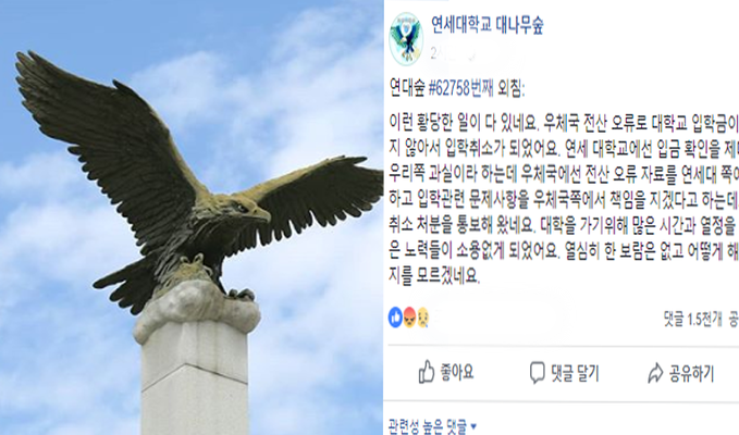 ▲ 수험생 A씨는 지난 14일 SNS서 "우체국 전산오류로 연세대 입학이 취소됐다"며 억울함을 호소했다. [연세대학교 인스타그램 ·페이스북 '연세대학교 대나무숲' 캡처]