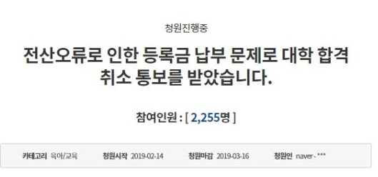▲ 수험생 A씨는 지난 14일 "전산오류로 인한 등록금 납부 문제로 대학 합격 취소 통보를 받았습니다"라는 글을 통해 연세대학교입학 취소에 대한 억울함을 호소했다. [청와대 국민청원 웹사이트 캡처]