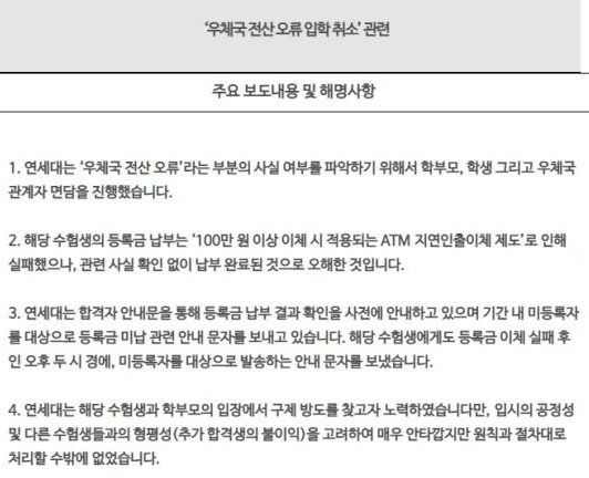 다수의 매체를 통해 A씨의 사연이 보도되자 연세대는 해명자료를 통해 "학부모와 학생, 그리고 우체국 관계자 면담을 진행했다"며 "수험생의 등록금 납부는 '100만원 이상 이체 시 적용되는 ATM 지연 인출 이체제도'로 인해 실패했으나, 관련 사실 확인 없이 납부 완료된 것으로 오해한 것"이라고 이날 오후 해명했다.