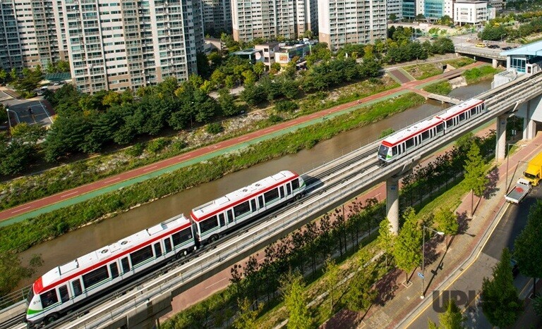 | ▲ 천변 고가선로를 교차 운행 중인 의정부경전철 [의정부시 제공] |