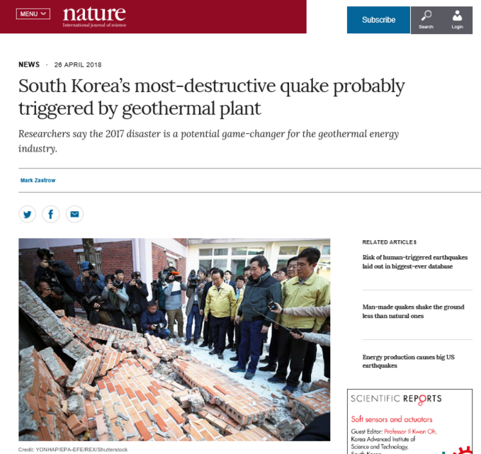 ▲ 영국의 과학전문 저널 <네이처>는 지난해 4월 ‘한국 최악의 지진은 지열발전소서 촉발됐다’는 기사를 배포했다. [네이처 홈페이지 캡처]