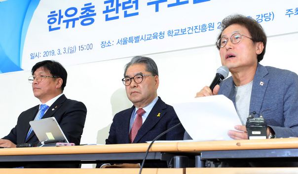 ▲ 지난 3일 오후 서울 종로구 서울시교육청에서 서울과 경기, 인천 교육감들이 한유총 개학 연기 관련 공동 기자회견을 하고 있다. 왼쪽부터 도성훈 인천시교육감, 이재정 경기도교육감, 조희연 서울시교육감. [뉴시스]