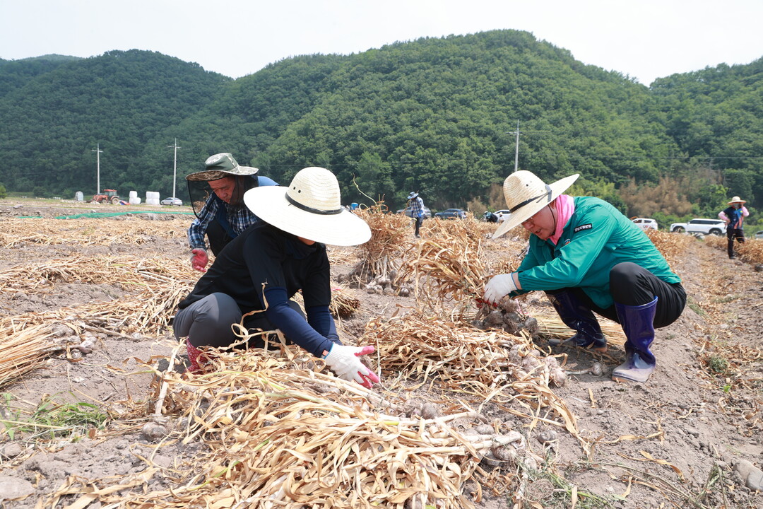 이번 일손 돕기에서는 양파·마늘 21개 농가(5.1ha)에 440여 명의 인력이 투입돼 수확에 구슬땀을 흘렸다.