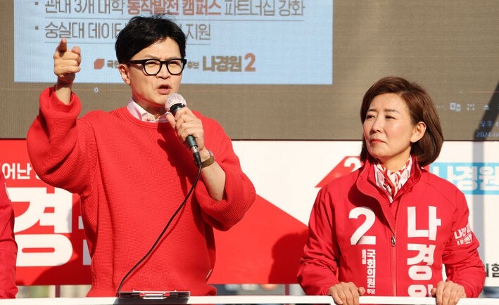 | ▲ 22대 총선 직전인 4월 5일 당시 국민의힘 한동훈 비대위원장(왼쪽)이 서울 동작구 남성사계시장에서 지원 연설을 통해 나경원 동작을 후보에 대한 지지를 호소하고 있다. [뉴시스] |