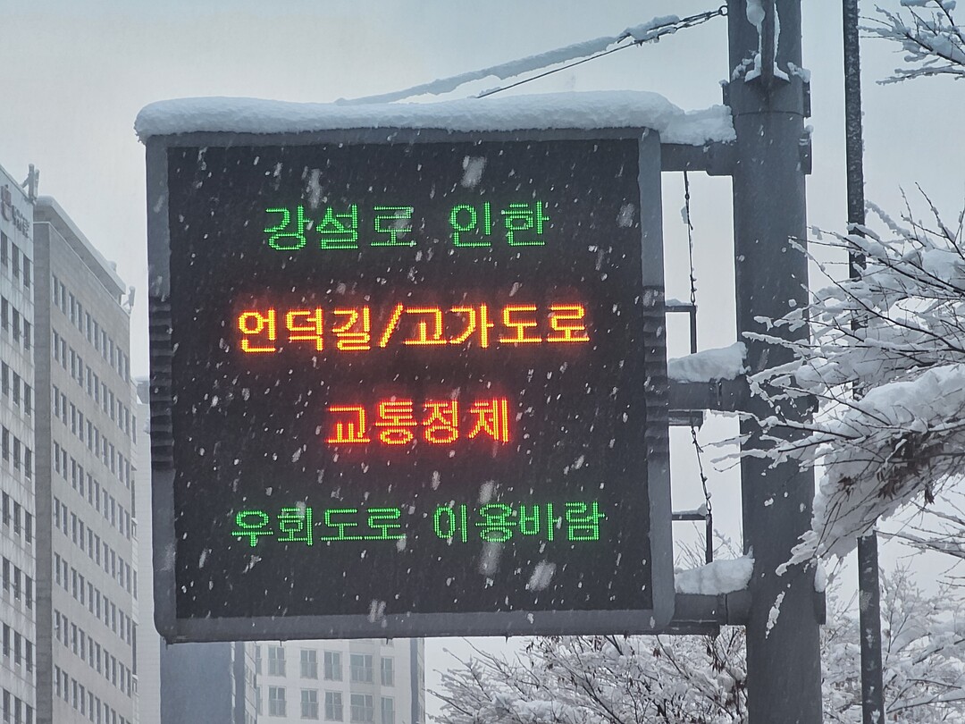 도로 곳곳이 거대한 주차장으로 변하자 수원시는 교통상황판을 통해 강설로 인한 언덕길·고가도로 교통통제 상황을 알리며 우회도로 이용을 알렸다.