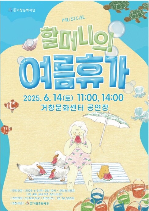 경남 거창문화재단(이사장 구인모 군수)은 6월 14일 오전 11시와 오후 2시에 거창문화센터 공연장에서 가족뮤지컬 '할머니의 여름휴가'를 개최한다고 27일 밝혔다.