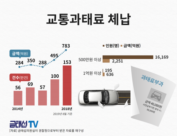 교통과태료는 2014년 이후 매해 1천만 건 이상 부과되고 있다. 부과 금액은 2014년 5464억 원에서 2018년 7465억 원으로 36.6% 증가했다.