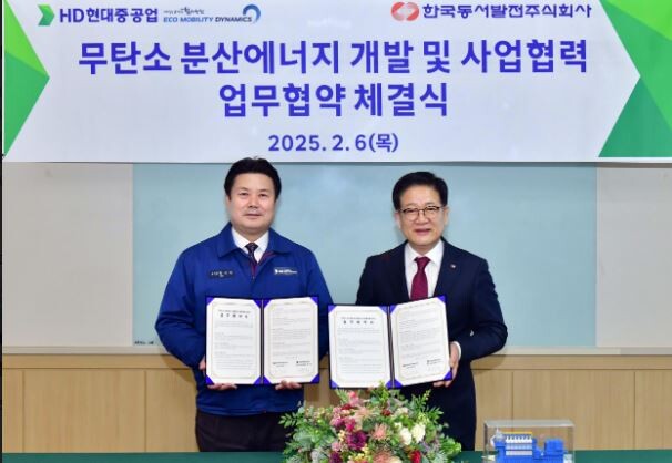 한국동서발전은 6일 HD현대중공업 울산 본사에서 '무탄소 분산에너지 개발 및 사업협력을 위한 업무협약'을 체결했다.