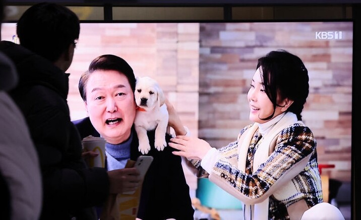 | ▲ 지난 2월 7일 서울역 대합실 텔레비전에서 방영되는 KBS 신년 대담에 윤석열 대통령과 부인 김건희 여사의 사진이 나오고 있다. [뉴시스] |